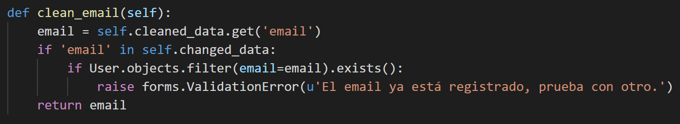 ¿Cómo lo hacemos? Pues por suerte para nosotros hay una lista llamada changed_data a la que podemos acceder desde el método clean, desde ahí es muy fácil comprobar si ha cambiado el email: